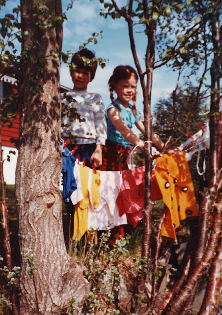 Her er bror min og eg i 1983. Eg har nettopp vaska kleda til dokka mi (for hand i vasken på badet), og står og heng ut dei nyvaska kleda på klessnora (mi) i hagen. Eg hugsar den gode lukta av nyvaska klede og kjensla av å ta inn knusktørre, stive plagg. Kleda hadde eg og bror min gått med då vi var babyar, så dei var eigentleg litt for store for dokka. Og ho voks irriterande nok aldri inn i dei, heller. Men klesvask måtte til med jamne mellomrom. Dokka var jo med over alt og blei lortete, ho bæsja seg ut, osv.